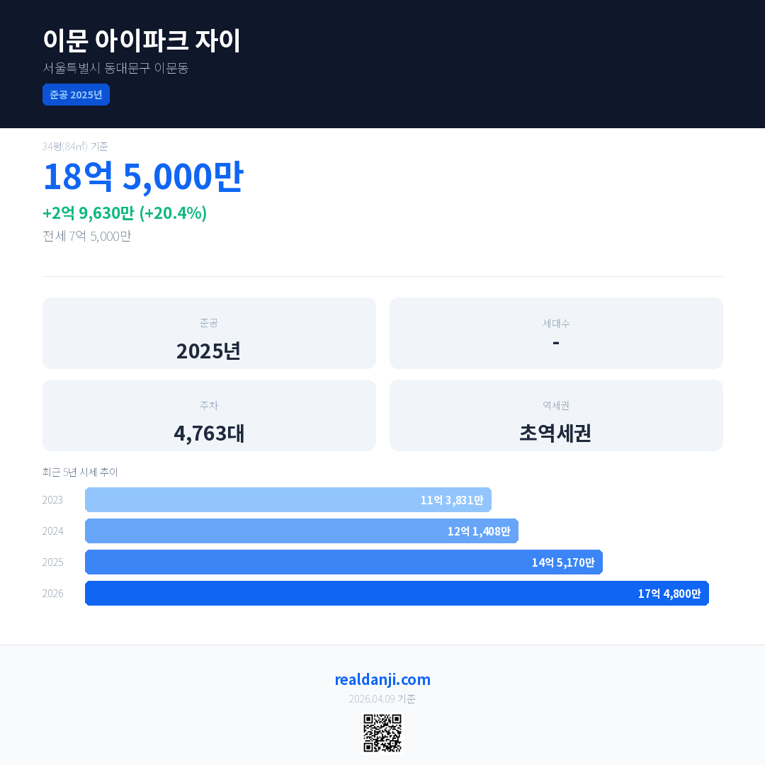 이문 아이파크 자이 국민평형 기준 2026년 평균 거래가는 17억 4,800만으로, 전년 대비 20.4% 상승 했습니다.