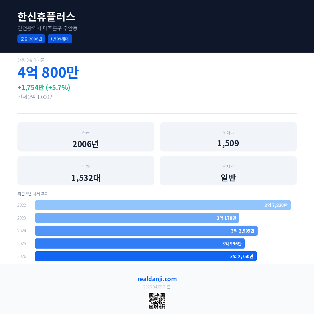 한신휴플러스 최근 거래가는 4억 800만입니다. (2026-03)