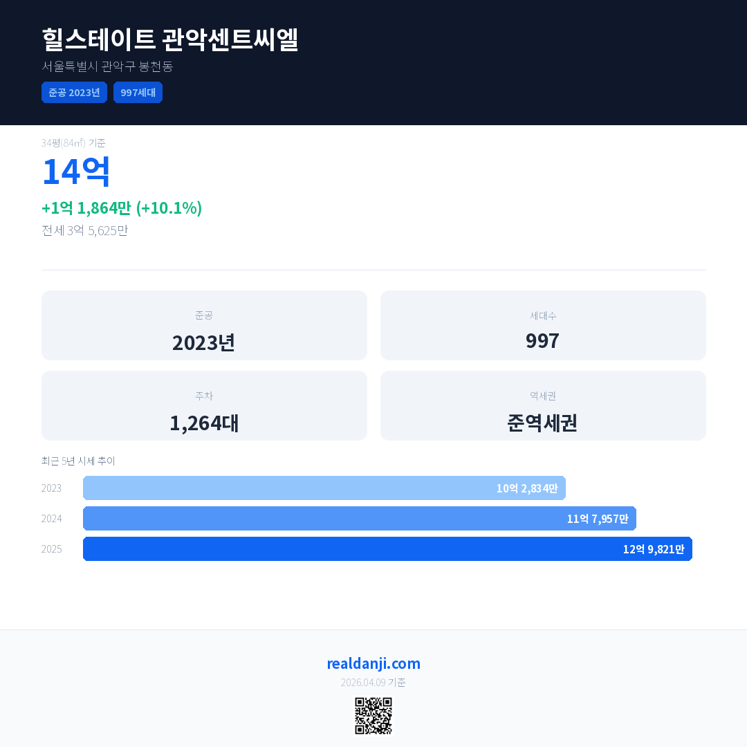 힐스테이트 관악센트씨엘 국민평형 기준 2025년 평균 거래가는 12억 9,821만으로, 전년 대비 10.1% 상승 했습니다.