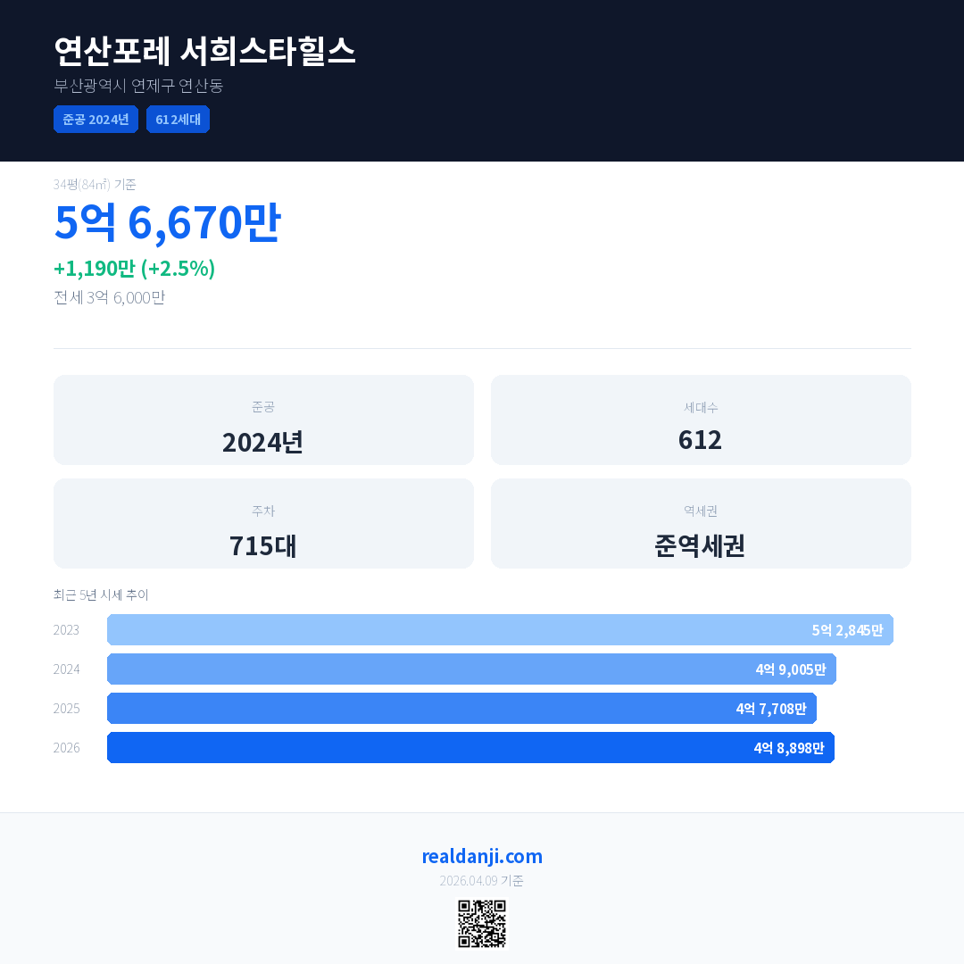 연산포레 서희스타힐스 국민평형 기준 2026년 평균 거래가는 4억 8,898만으로, 전년 대비 2.5% 상승 했습니다.