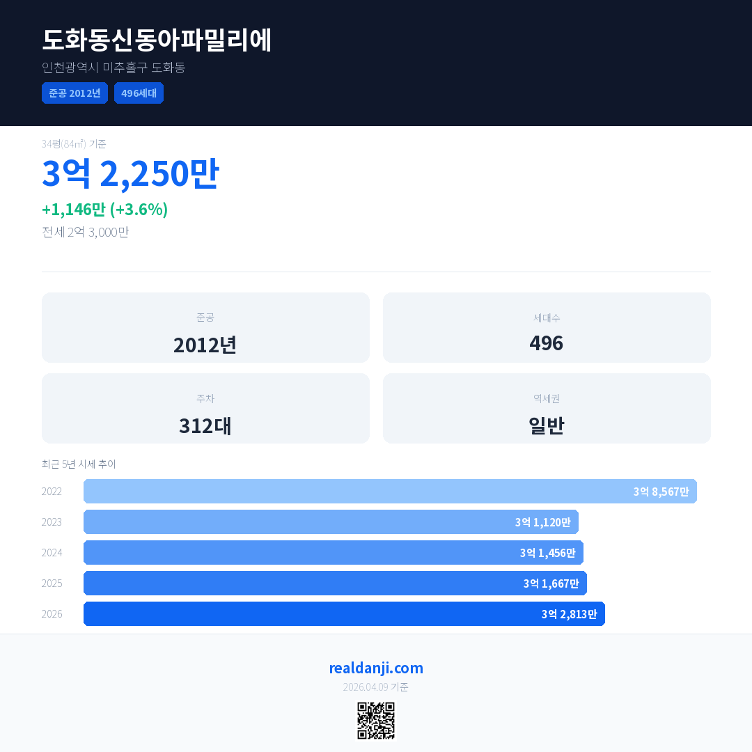 도화동신동아파밀리에 국민평형 기준 2026년 평균 거래가는 3억 2,813만으로, 전년 대비 3.6% 상승 했습니다.