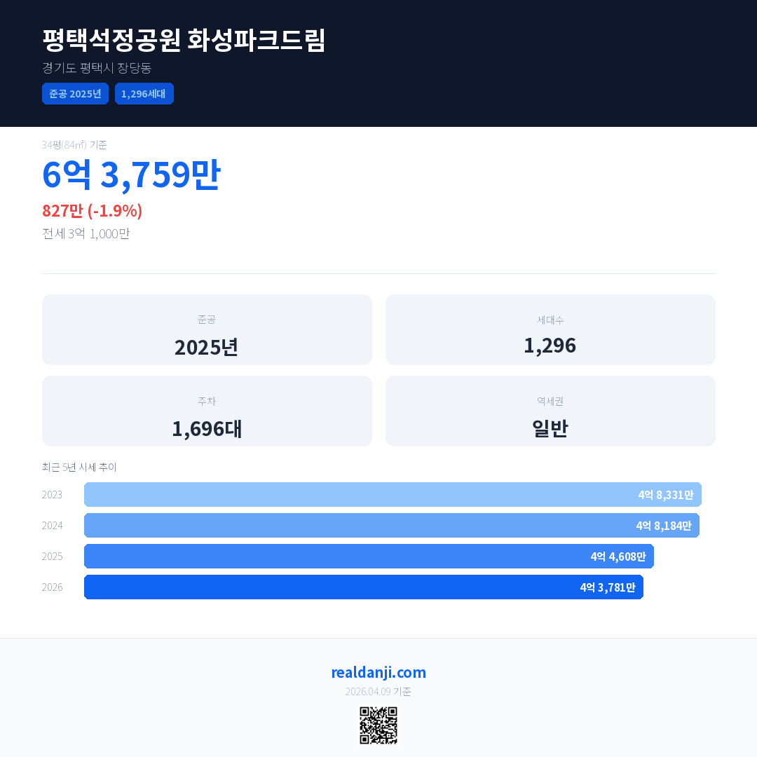 평택석정공원 화성파크드림 최근 거래가는 6억 3,759만입니다. (2026-03)