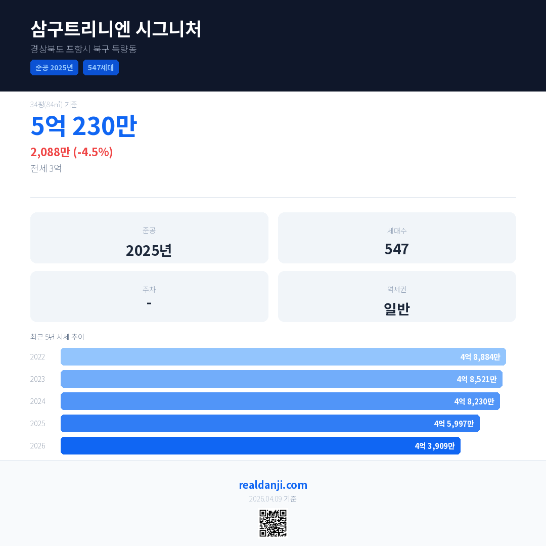 삼구트리니엔 시그니처 국민평형 기준 2026년 평균 거래가는 4억 3,909만으로, 전년 대비 4.5% 하락 했습니다.