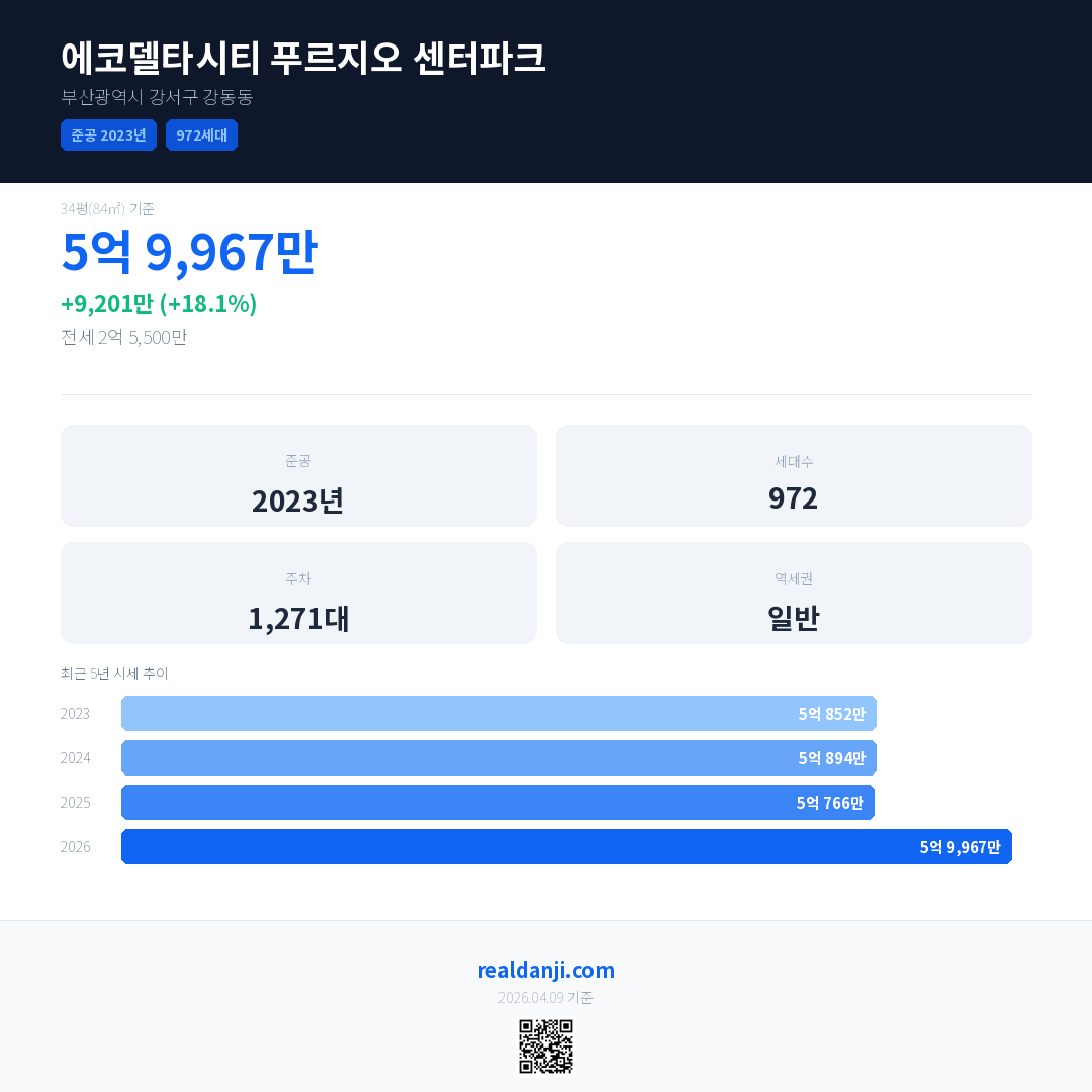 에코델타시티 푸르지오 센터파크 국민평형 기준 2026년 평균 거래가는 5억 9,967만으로, 전년 대비 18.1% 상승 했습니다.