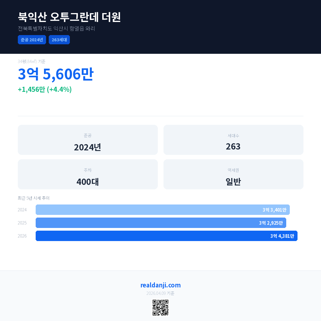북익산 오투그란데 더원 최근 거래가는 3억 5,606만입니다. (2026-04)