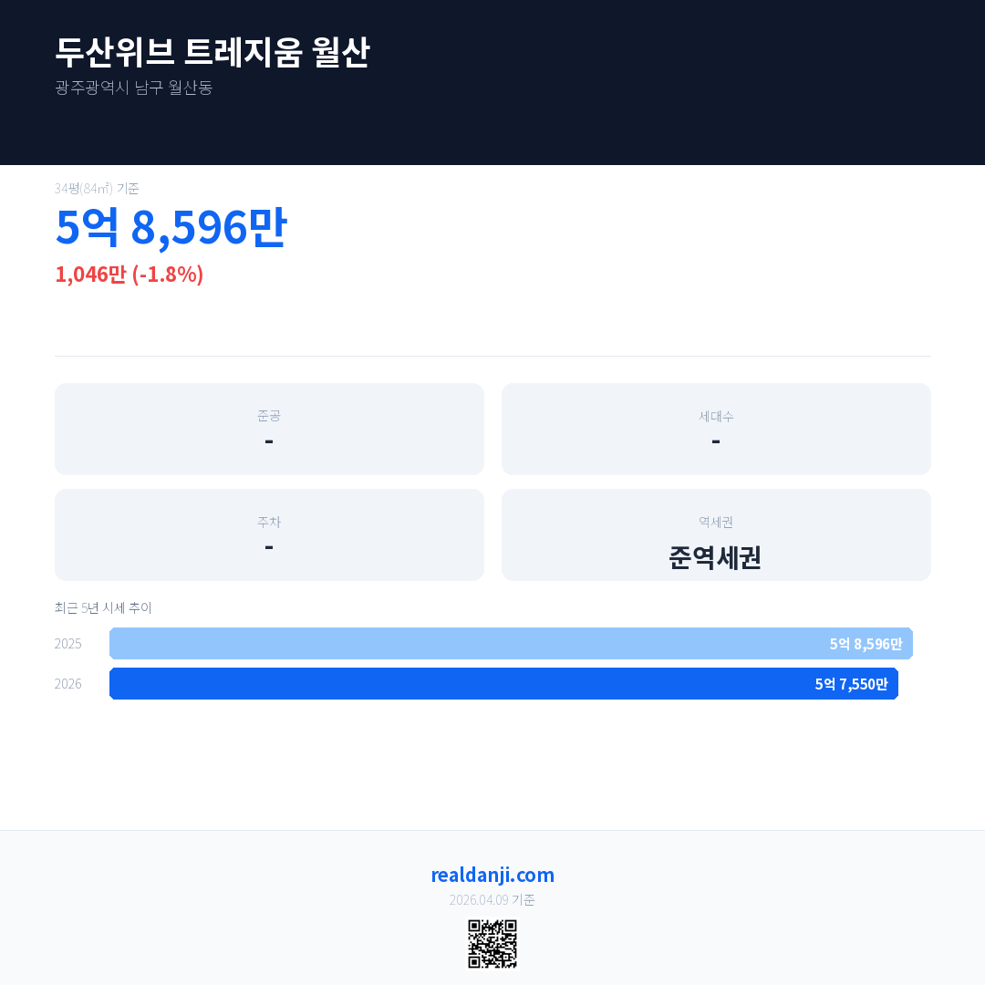 두산위브 트레지움 월산 국민평형 기준 2026년 평균 거래가는 5억 7,550만으로, 전년 대비 1.8% 하락 했습니다.