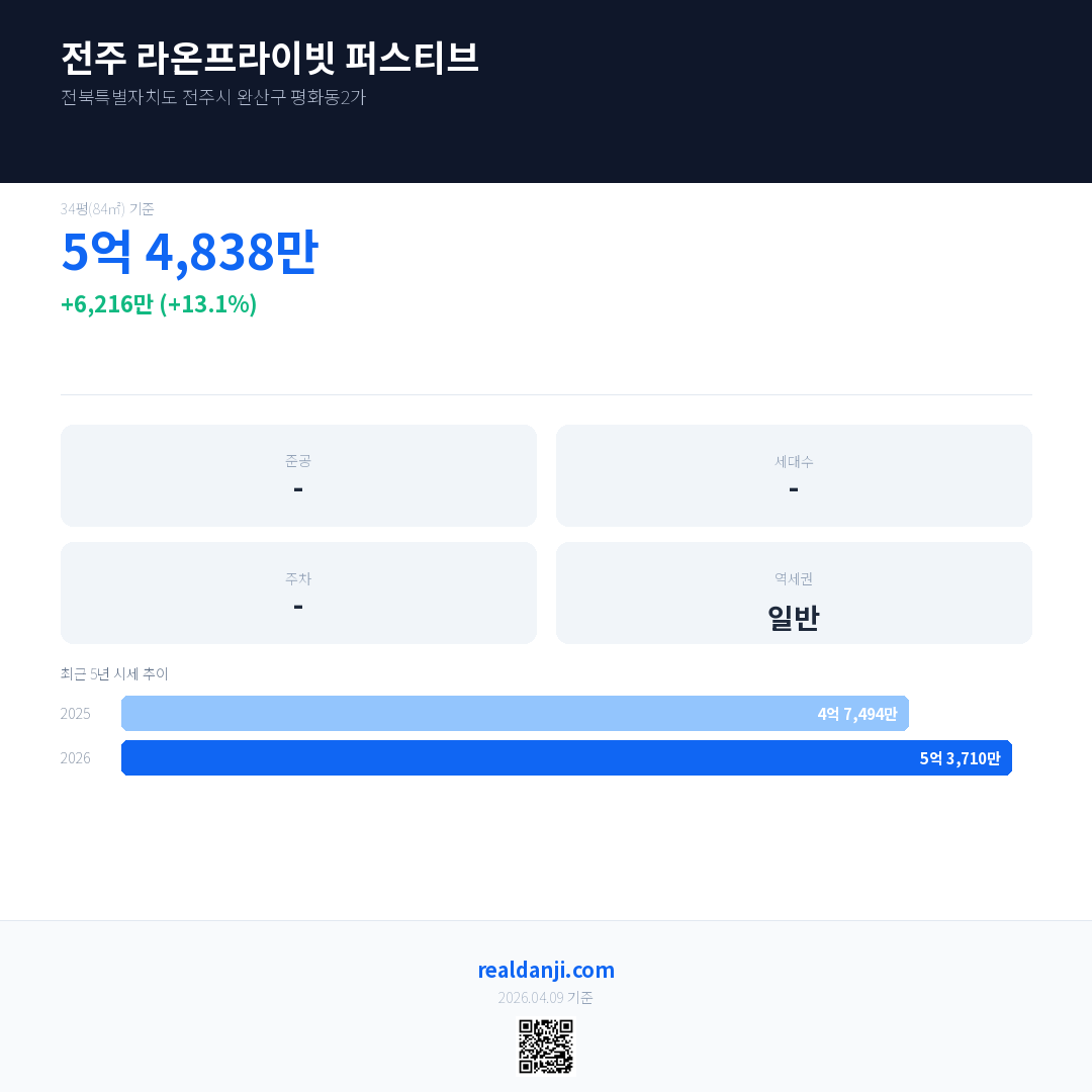 전주 라온프라이빗 퍼스티브 국민평형 기준 2026년 평균 거래가는 5억 3,710만으로, 전년 대비 13.1% 상승 했습니다.