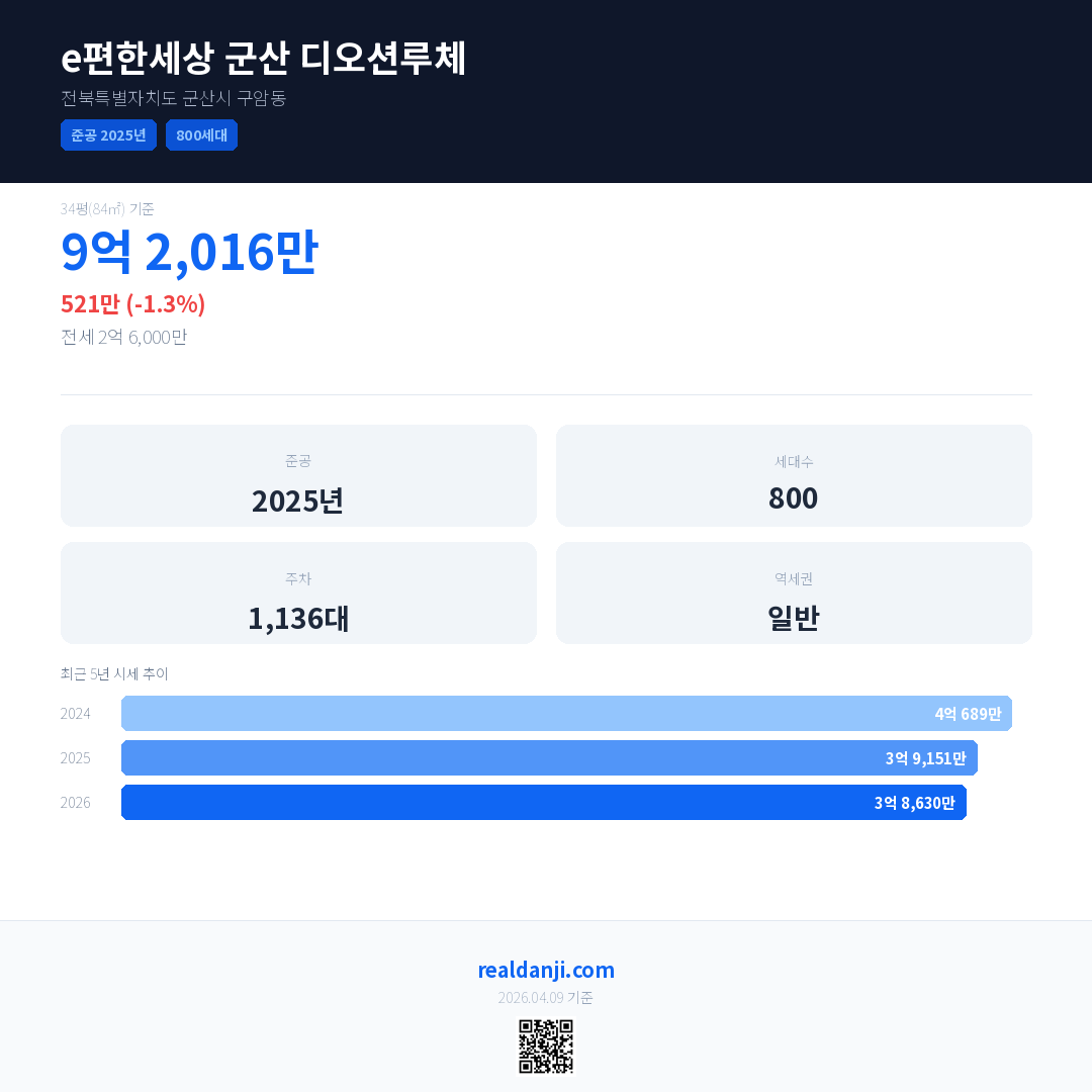 e편한세상 군산 디오션루체 최근 거래가는 9억 2,016만입니다. (2026-03)