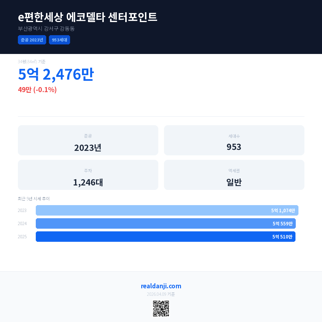 e편한세상 에코델타 센터포인트 국민평형 기준 2025년 평균 거래가는 5억 510만으로, 전년 대비 0.1% 하락 했습니다.