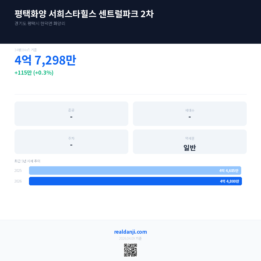 평택화양 서희스타힐스 센트럴파크 2차 최근 거래가는 4억 7,298만입니다. (2026-03)