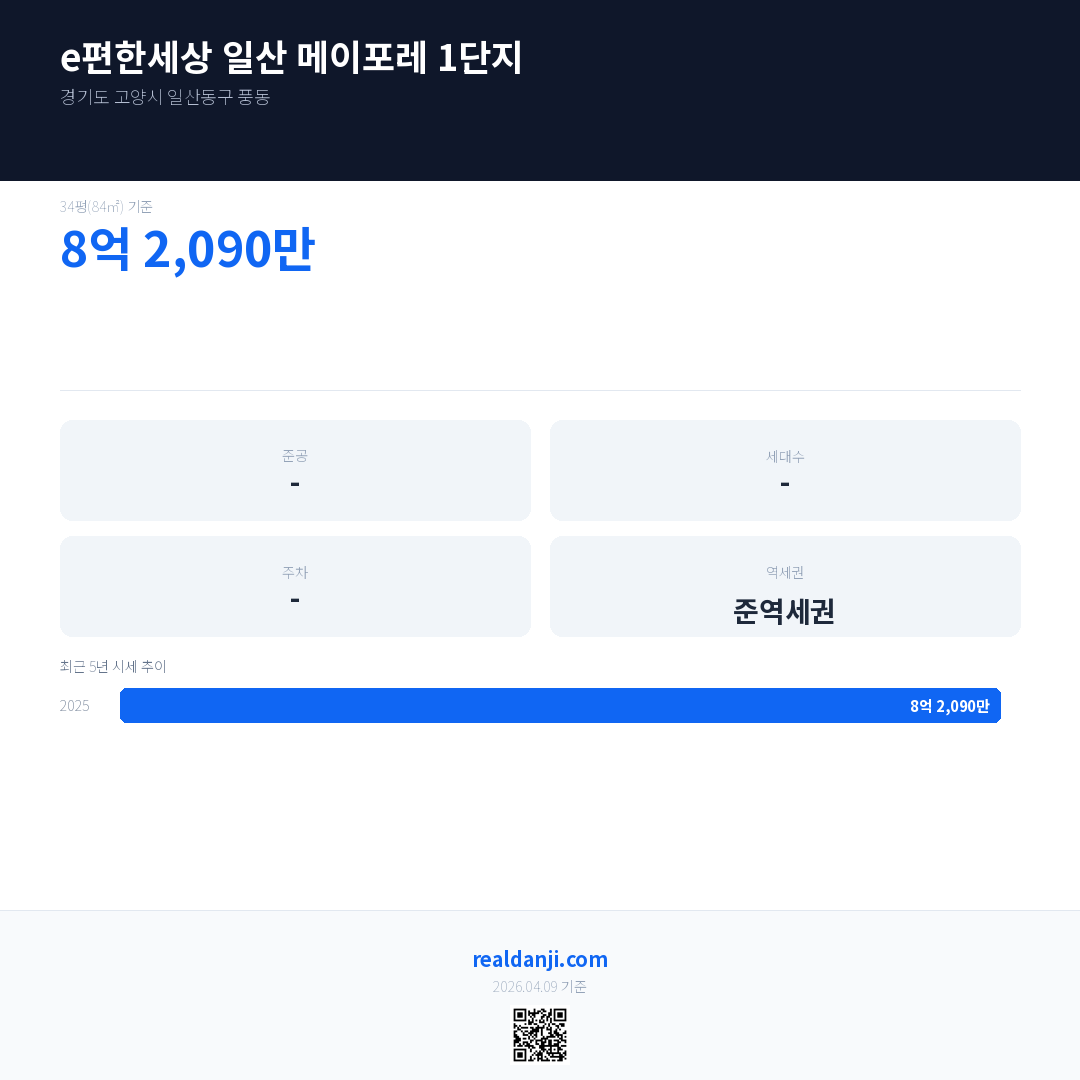 e편한세상 일산 메이포레 1단지 최근 거래가는 8억 2,090만입니다. (2026-03)