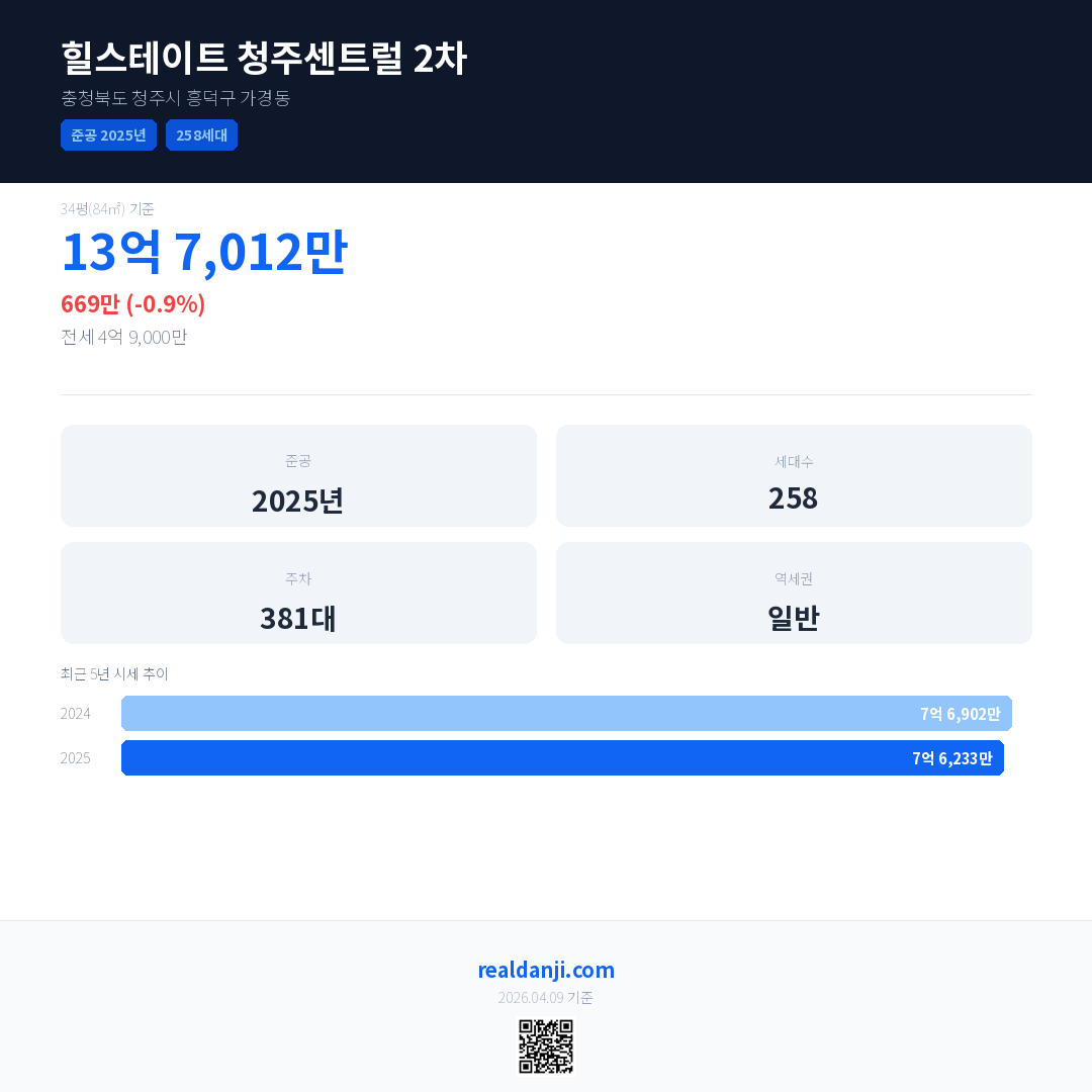 힐스테이트 청주센트럴 2차 국민평형 기준 2025년 평균 거래가는 7억 6,233만으로, 전년 대비 0.9% 하락 했습니다.