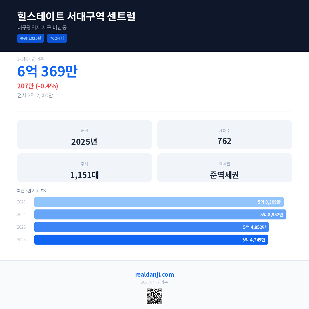 힐스테이트 서대구역 센트럴 최근 거래가는 5억 8,399만입니다. (2026-03)