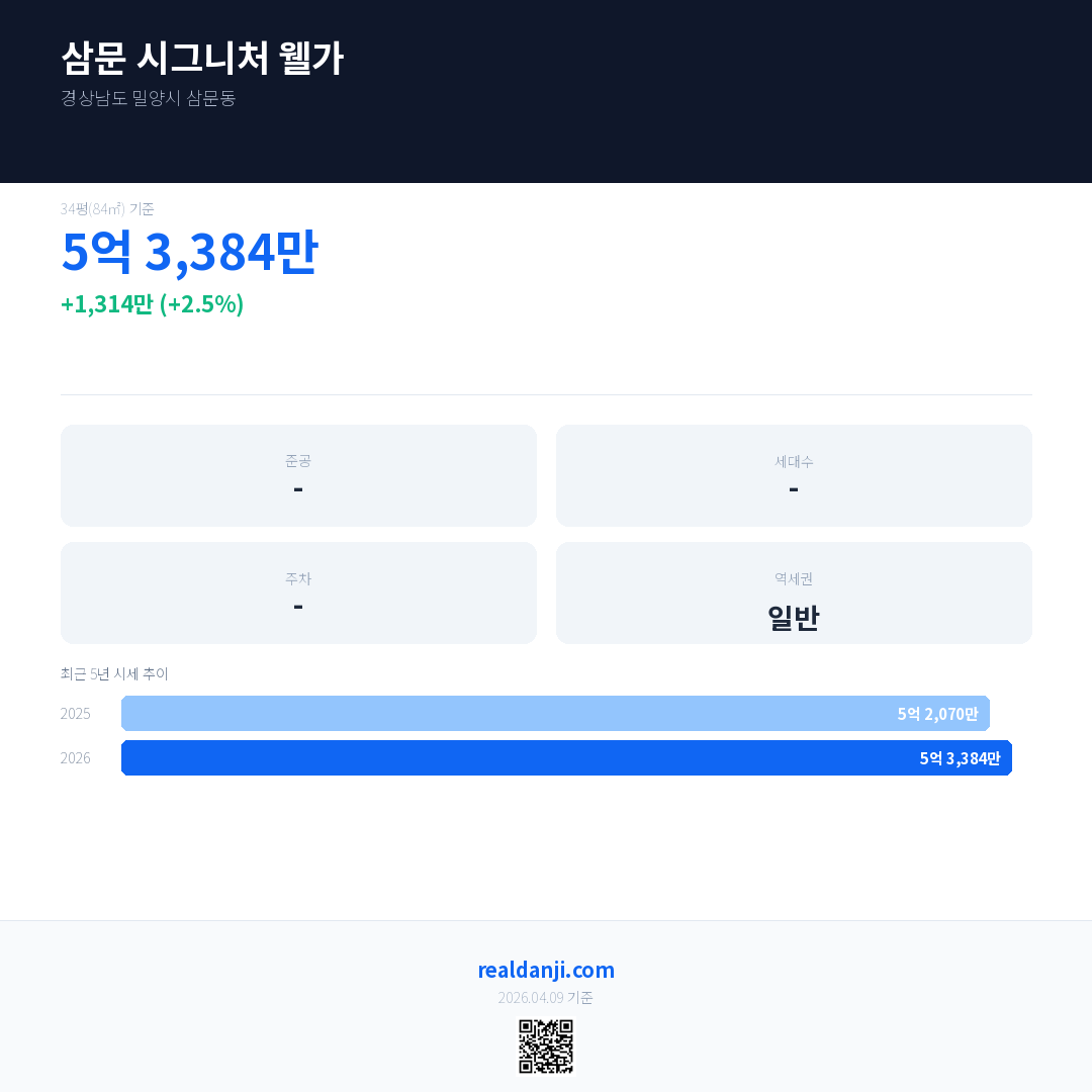 삼문 시그니처 웰가 국민평형 기준 2026년 평균 거래가는 5억 3,384만으로, 전년 대비 2.5% 상승 했습니다.