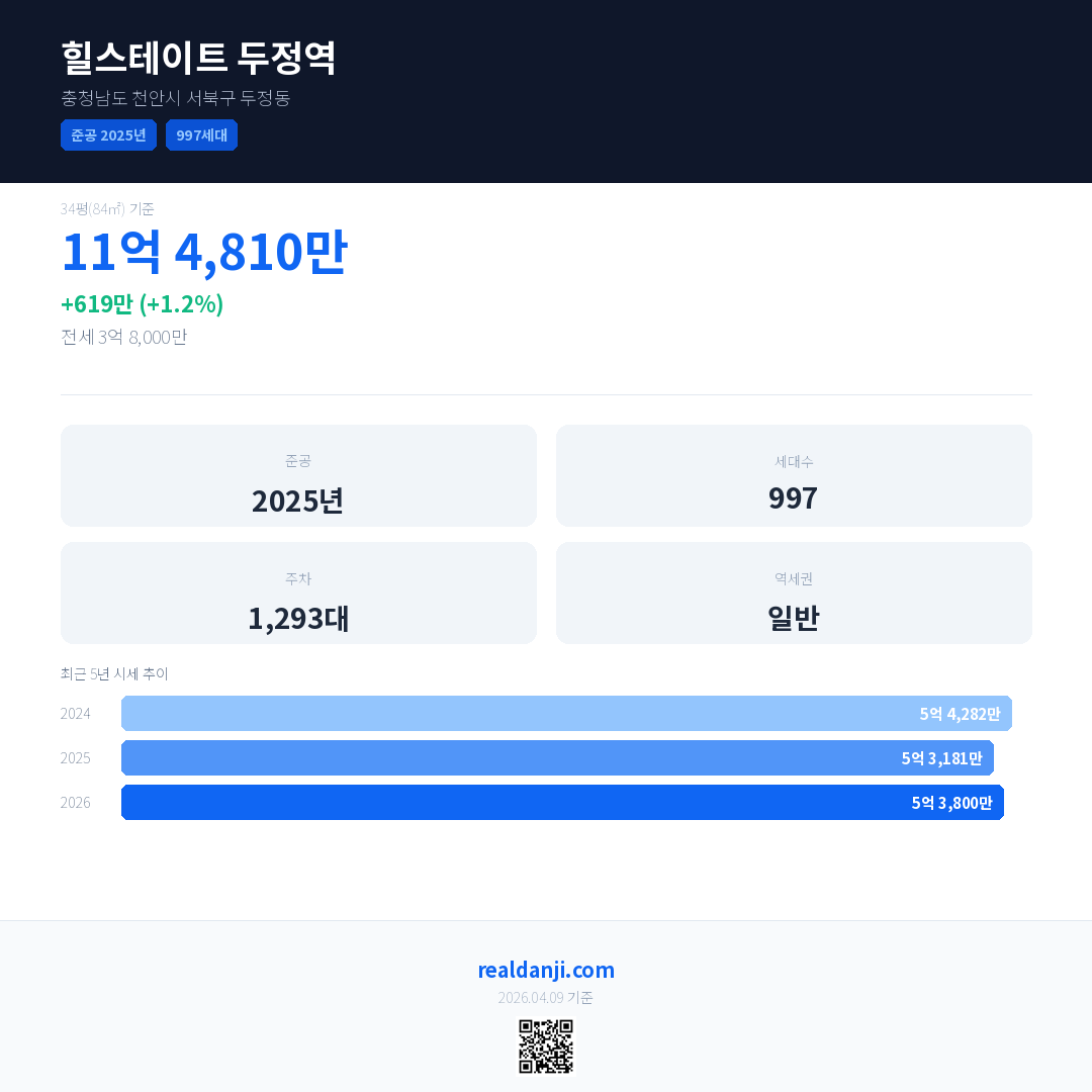힐스테이트 두정역 최근 거래가는 5억 3,800만입니다. (2026-03)