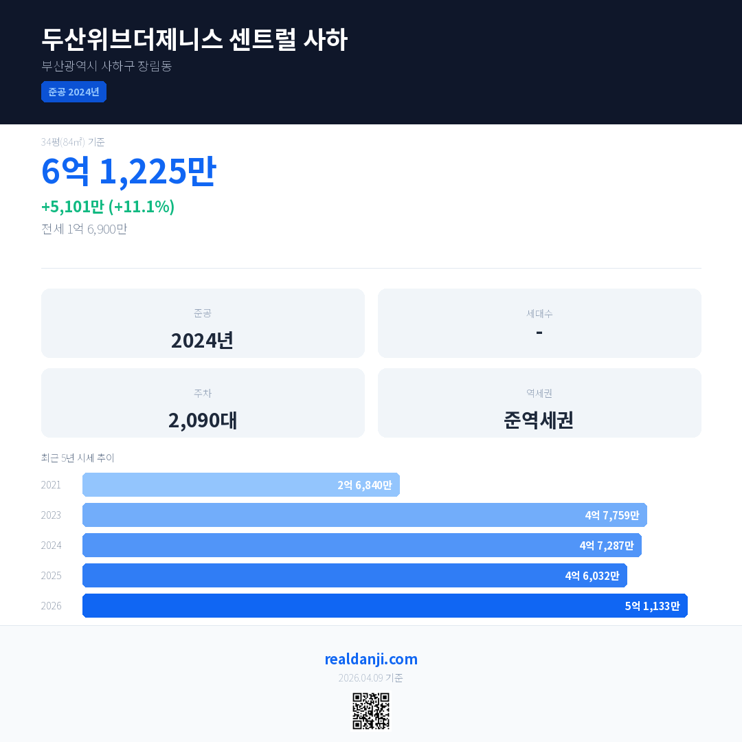 두산위브더제니스 센트럴 사하 최근 거래가는 6억 1,225만입니다. (2026-03)