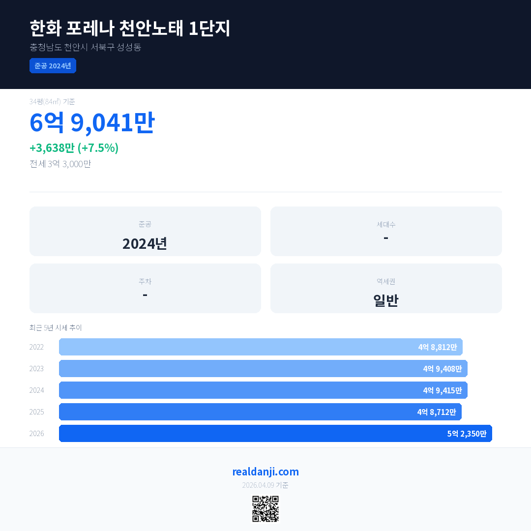 한화 포레나 천안노태 1단지 최근 거래가는 6억 9,041만입니다. (2026-04)