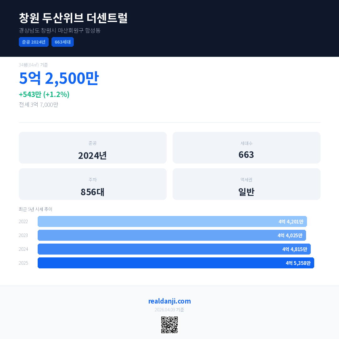 창원 두산위브 더센트럴 국민평형 기준 2025년 평균 거래가는 4억 5,358만으로, 전년 대비 1.2% 상승 했습니다.