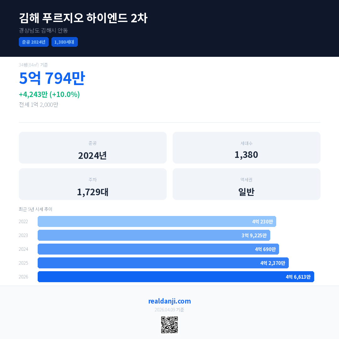김해 푸르지오 하이엔드 2차은(는) 2024년에 준공되었으며, 현재 2년차입니다. 총 1,380세대 규모입니다.