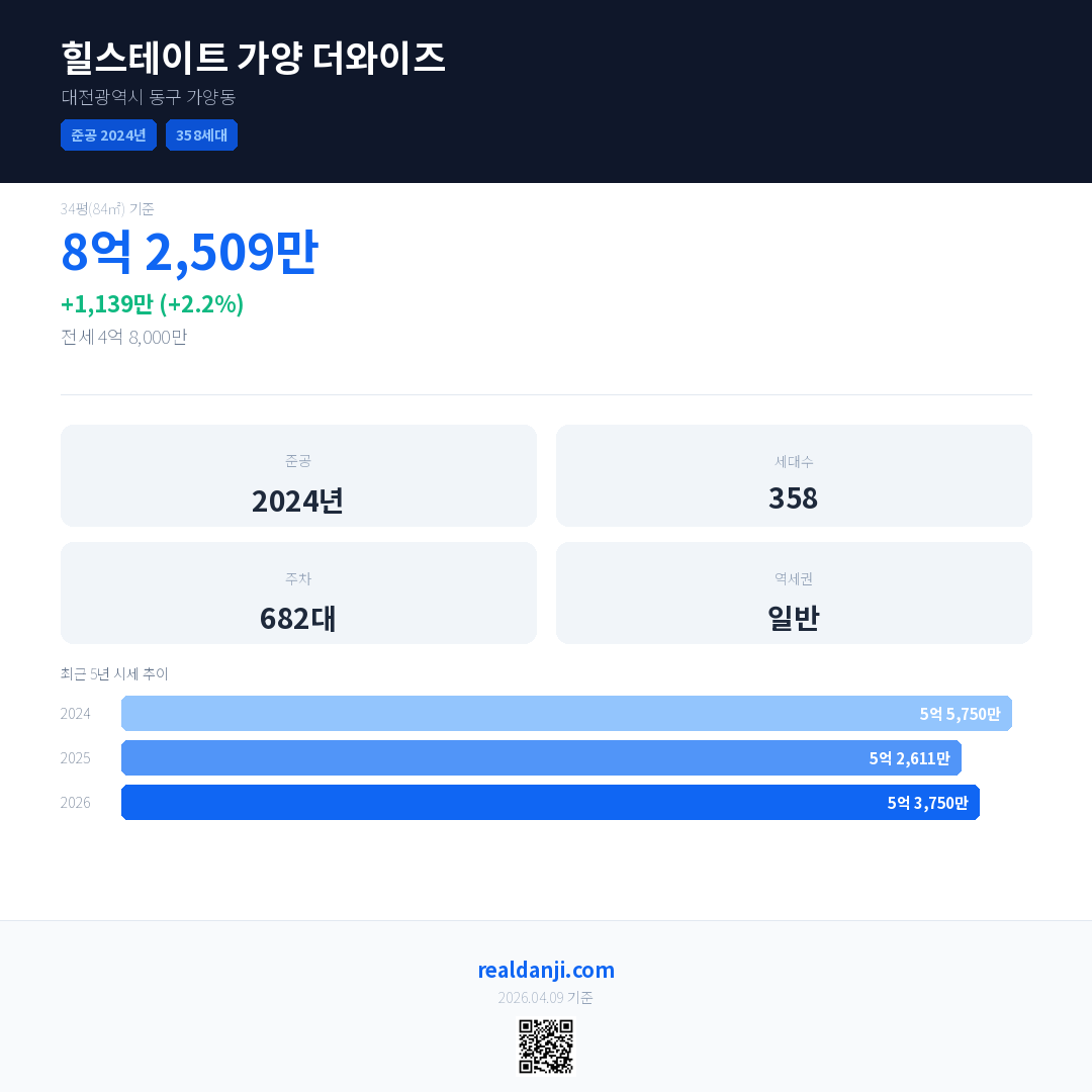 힐스테이트 가양 더와이즈 국민평형 기준 2026년 평균 거래가는 5억 3,750만으로, 전년 대비 2.2% 상승 했습니다.