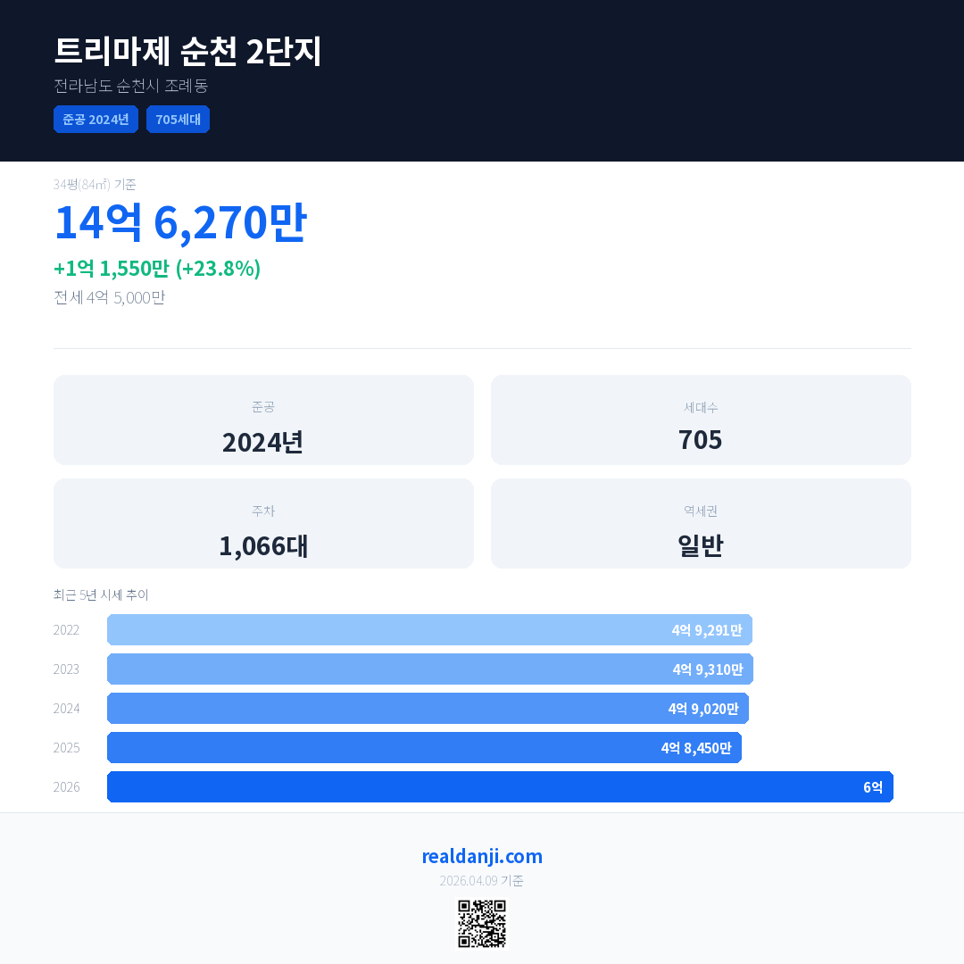 트리마제 순천 2단지 국민평형 기준 2026년 평균 거래가는 6억으로, 전년 대비 23.8% 상승 했습니다.