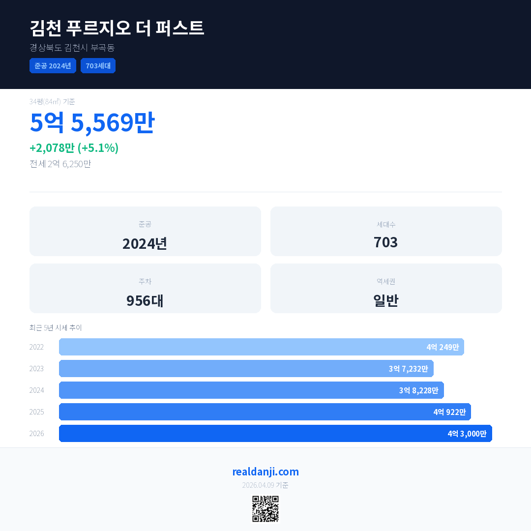 김천 푸르지오 더 퍼스트 국민평형 기준 2026년 평균 거래가는 4억 3,000만으로, 전년 대비 5.1% 상승 했습니다.