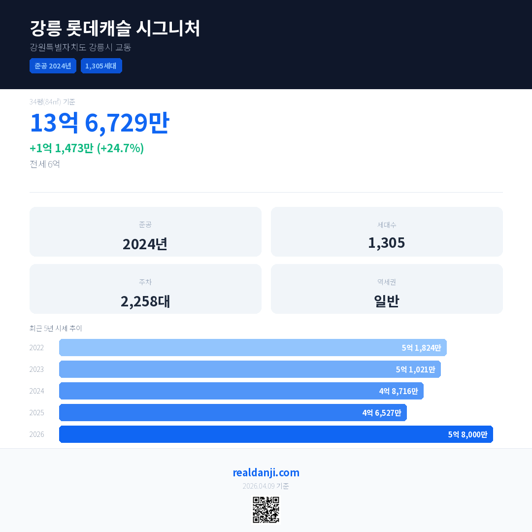 강릉 롯데캐슬 시그니처 국민평형 기준 2026년 평균 거래가는 5억 8,000만으로, 전년 대비 24.7% 상승 했습니다.