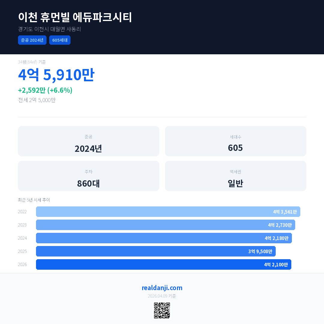 이천 휴먼빌 에듀파크시티 국민평형 기준 2026년 평균 거래가는 4억 2,100만으로, 전년 대비 6.6% 상승 했습니다.