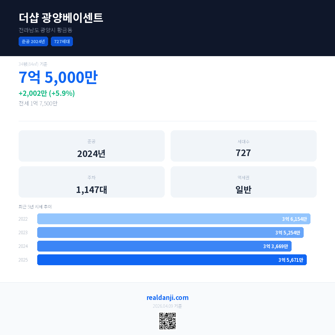 더샵 광양베이센트 국민평형 기준 2025년 평균 거래가는 3억 5,671만으로, 전년 대비 5.9% 상승 했습니다.