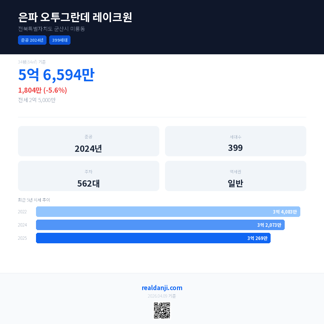 은파 오투그란데 레이크원 국민평형 기준 2025년 평균 거래가는 3억 269만으로, 전년 대비 5.6% 하락 했습니다.