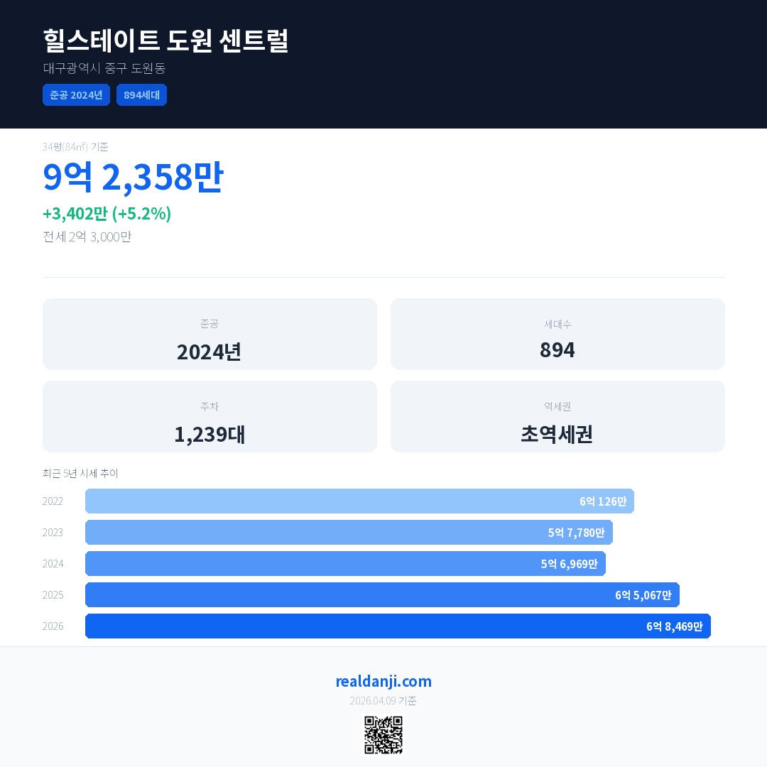 힐스테이트 도원 센트럴 국민평형 기준 2026년 평균 거래가는 6억 8,469만으로, 전년 대비 5.2% 상승 했습니다.