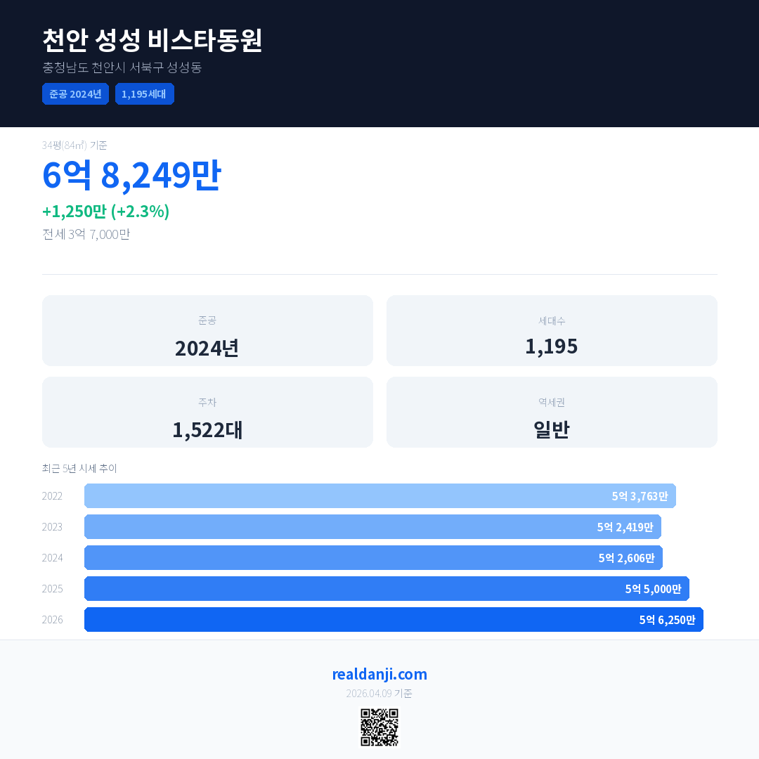 천안 성성 비스타동원 국민평형 기준 2026년 평균 거래가는 5억 6,250만으로, 전년 대비 2.3% 상승 했습니다.