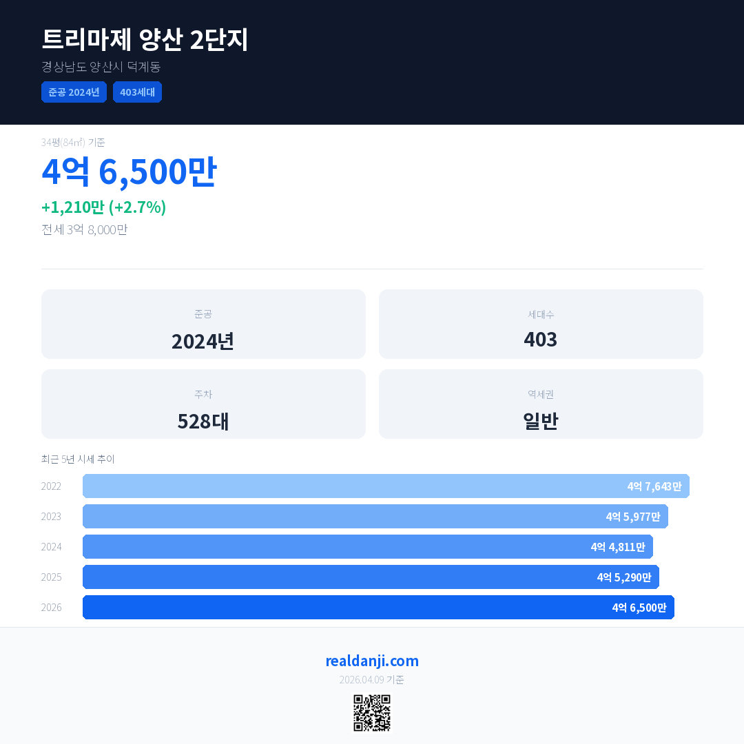 트리마제 양산 2단지 국민평형 기준 2026년 평균 거래가는 4억 6,500만으로, 전년 대비 2.7% 상승 했습니다.