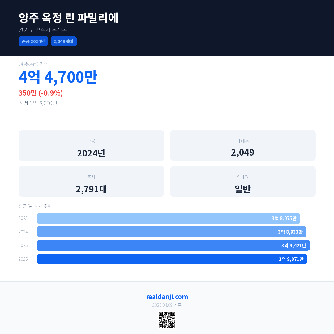 양주 옥정 린 파밀리에 국민평형 기준 2026년 평균 거래가는 3억 9,071만으로, 전년 대비 0.9% 하락 했습니다.