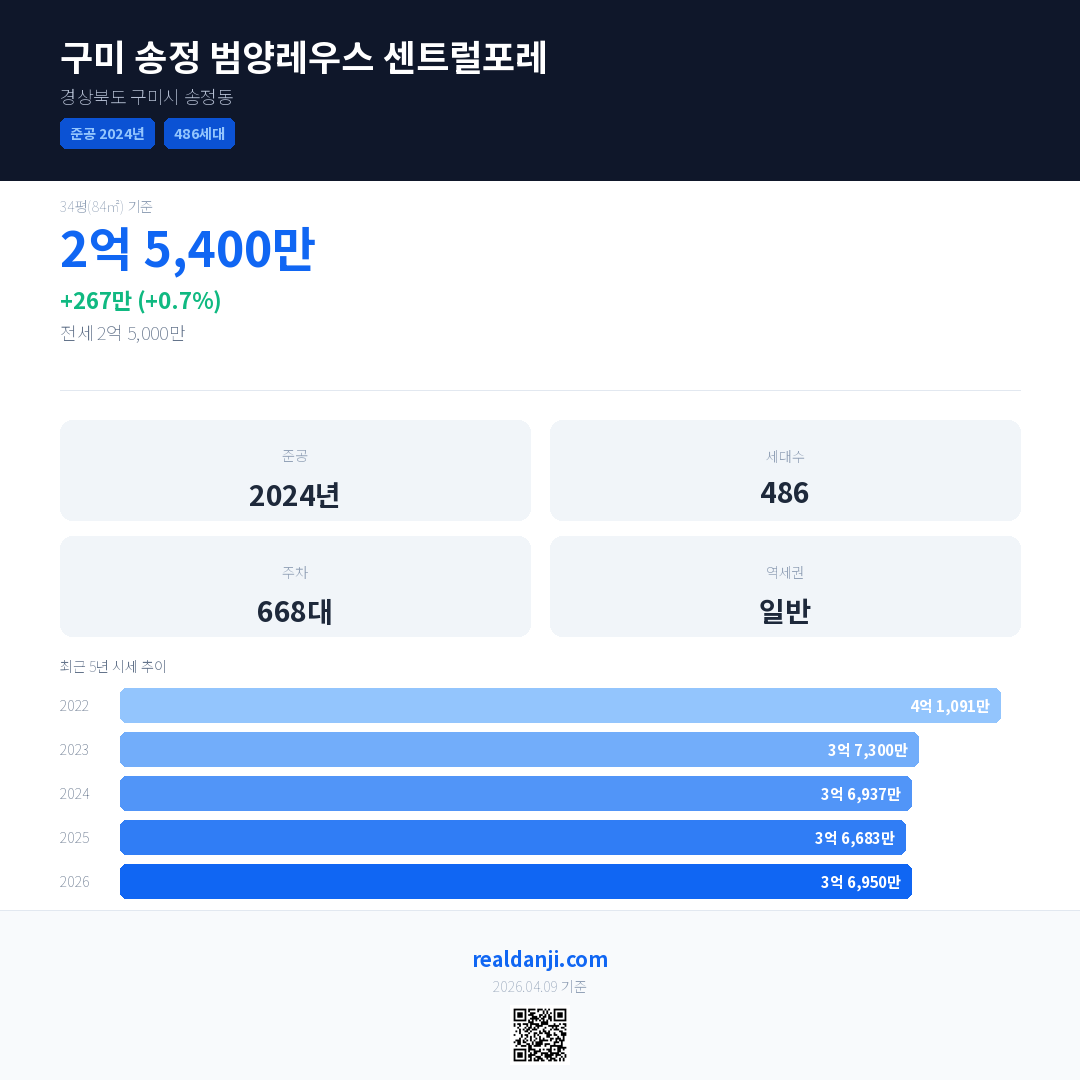 구미 송정 범양레우스 센트럴포레 국민평형 기준 2026년 평균 거래가는 3억 6,950만으로, 전년 대비 0.7% 상승 했습니다.
