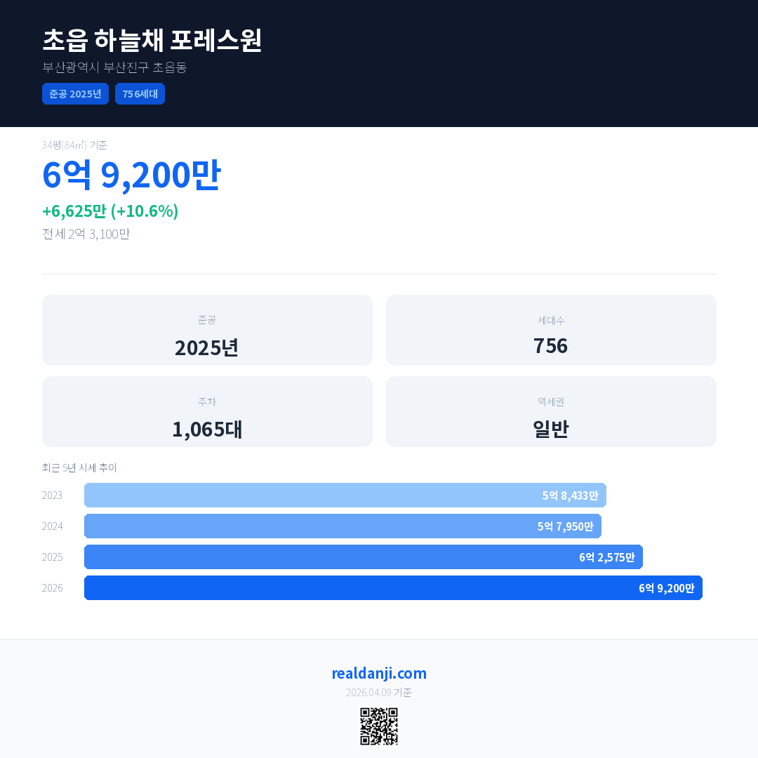 초읍 하늘채 포레스원 국민평형 기준 2026년 평균 거래가는 6억 9,200만으로, 전년 대비 10.6% 상승 했습니다.
