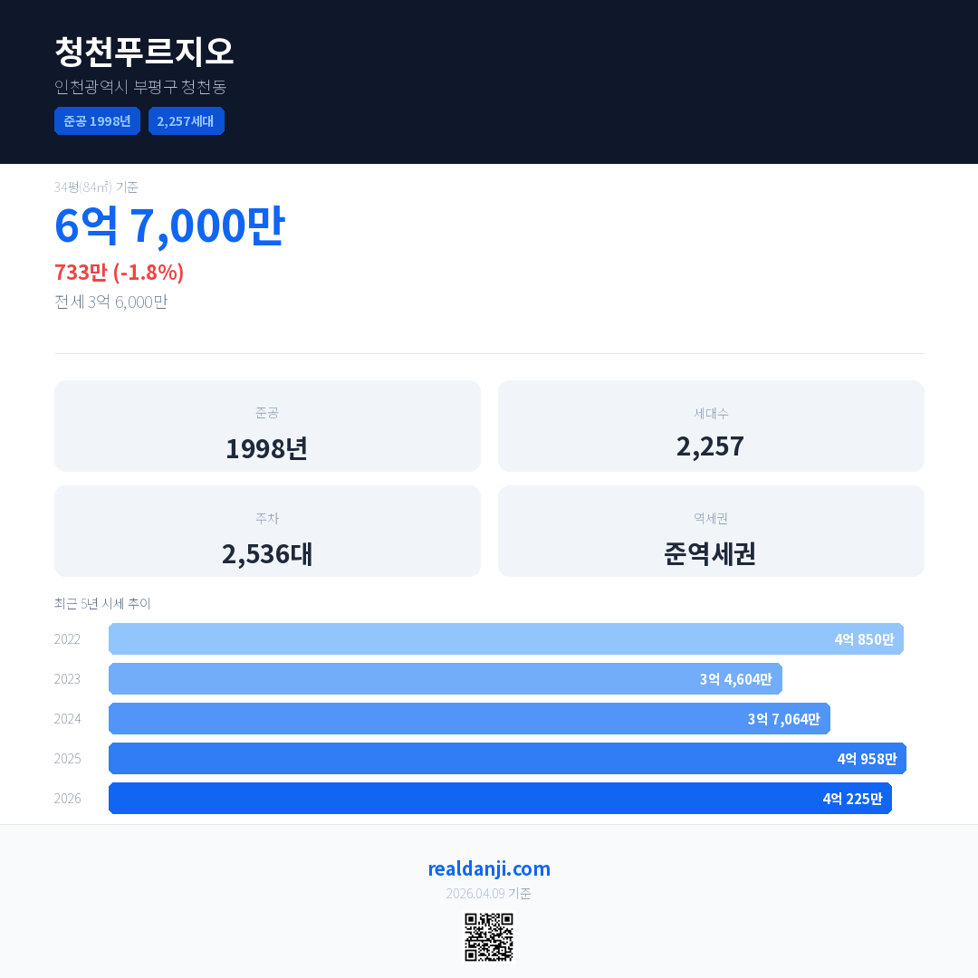 청천푸르지오 국민평형 기준 2026년 평균 거래가는 4억 225만으로, 전년 대비 1.8% 하락 했습니다.