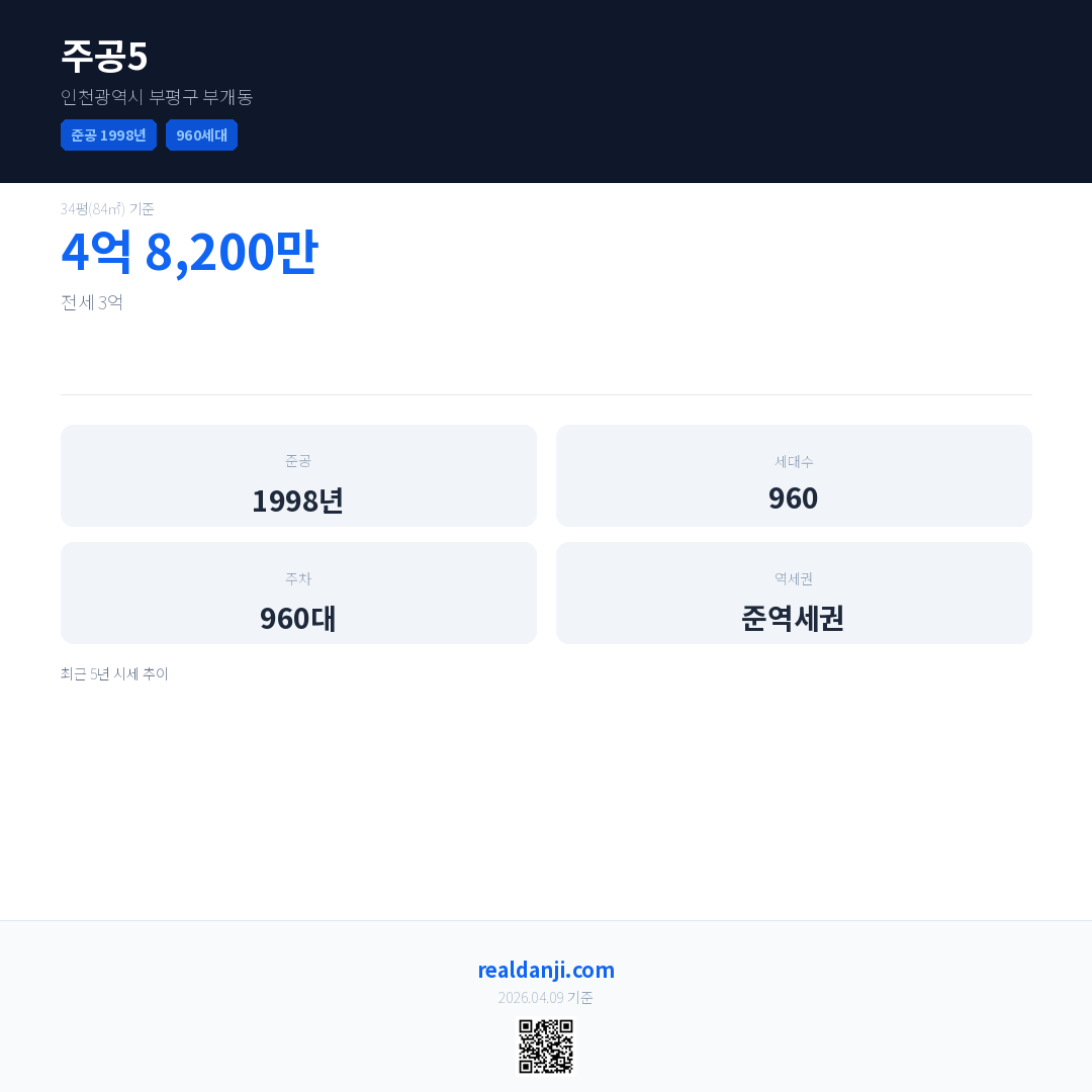 주공5은(는) 1998년에 준공되었으며, 현재 28년차입니다. 총 960세대 규모입니다.