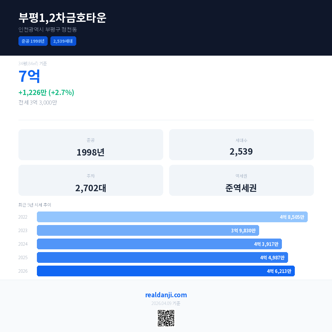 부평1,2차금호타운 최근 거래가는 7억입니다. (2026-04)