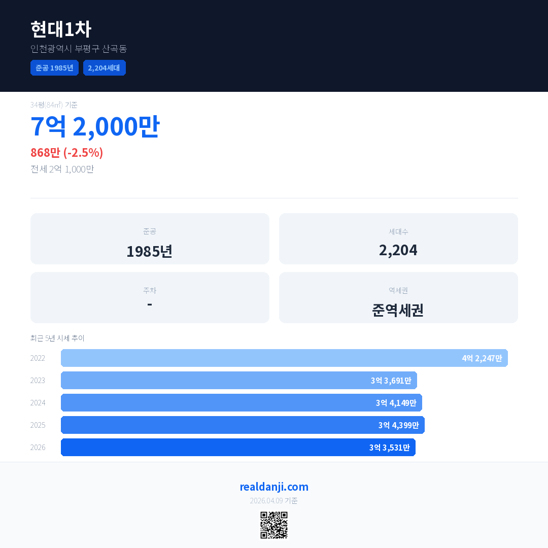 현대1차 국민평형 기준 2026년 평균 거래가는 3억 3,531만으로, 전년 대비 2.5% 하락 했습니다.