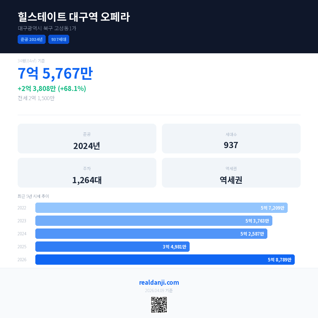 힐스테이트 대구역 오페라 국민평형 기준 2026년 평균 거래가는 5억 8,789만으로, 전년 대비 68.1% 상승 했습니다.