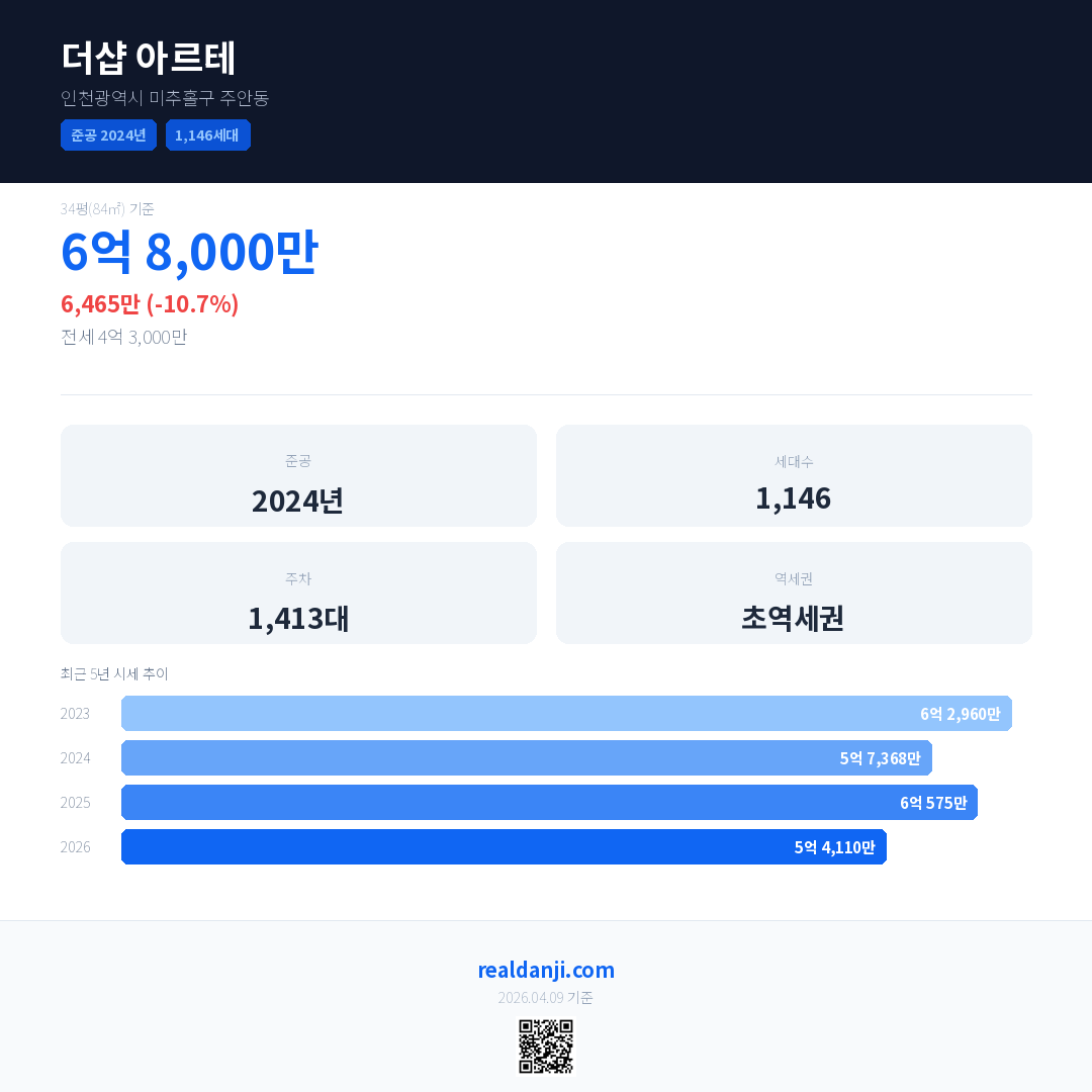 더샵 아르테 국민평형 기준 2026년 평균 거래가는 5억 4,110만으로, 전년 대비 10.7% 하락 했습니다.