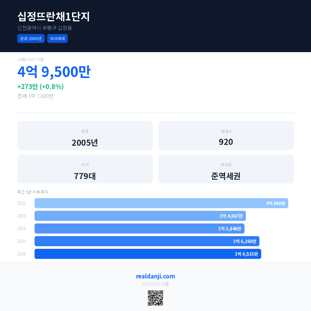 십정뜨란채1단지 최근 거래가는 4억 9,500만입니다. (2026-03)