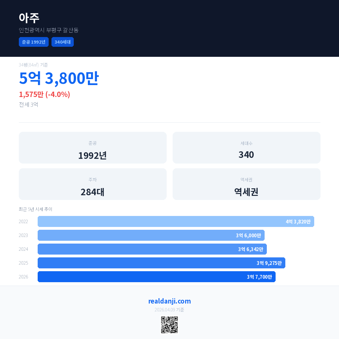 아주 국민평형 기준 2026년 평균 거래가는 3억 7,700만으로, 전년 대비 4.0% 하락 했습니다.
