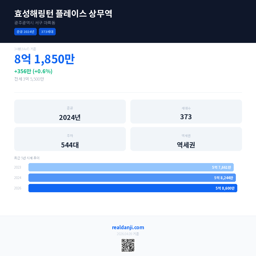 효성해링턴 플레이스 상무역은(는) 2024년에 준공되었으며, 현재 2년차입니다. 총 373세대 규모입니다.