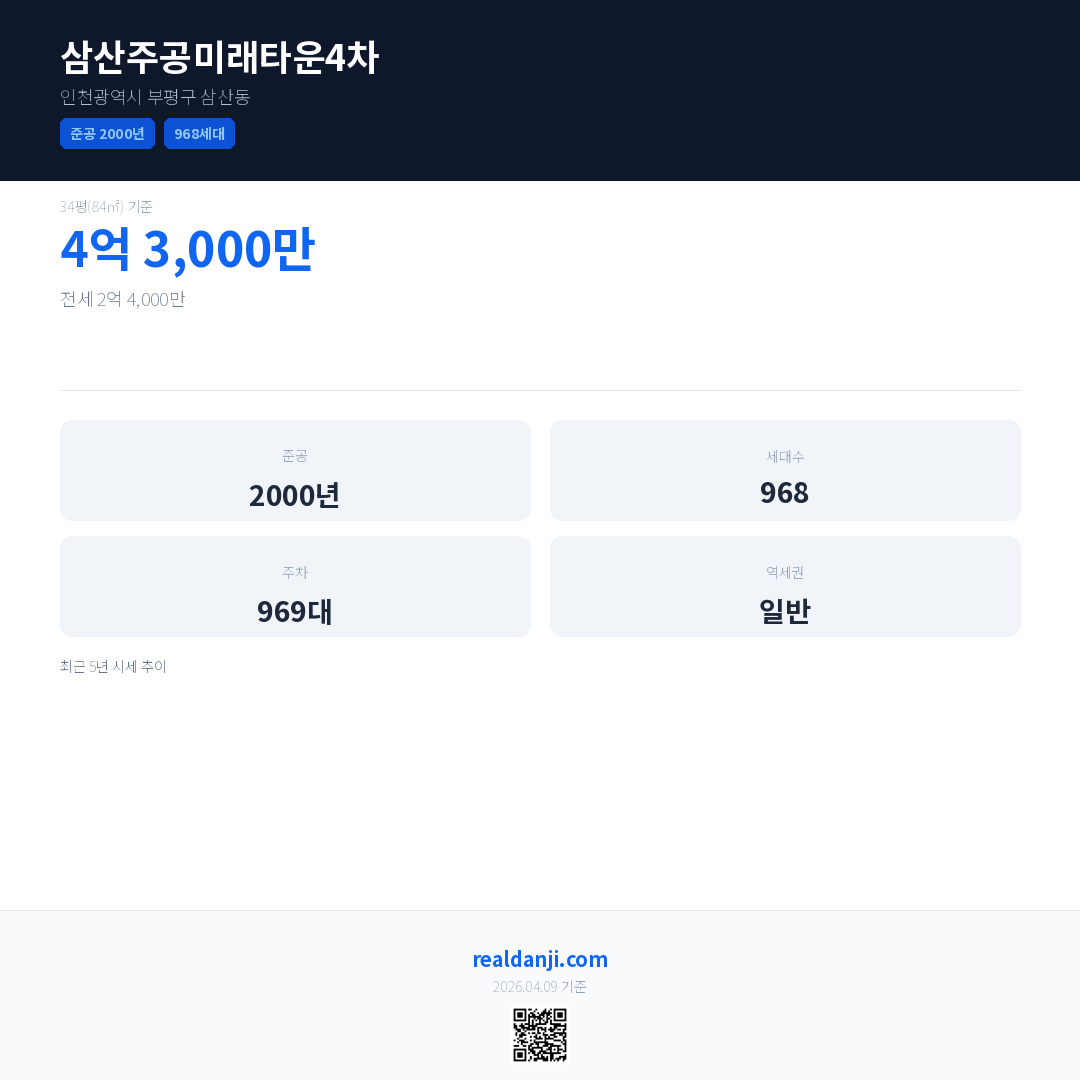 삼산주공미래타운4차 최근 거래가는 4억 3,000만입니다. (2026-04)