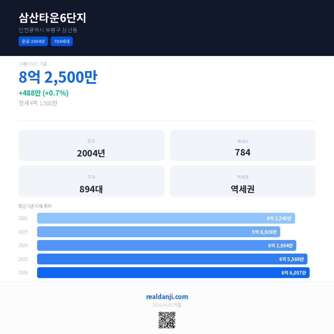 삼산타운6단지 국민평형 기준 2026년 평균 거래가는 6억 6,057만으로, 전년 대비 0.7% 상승 했습니다.