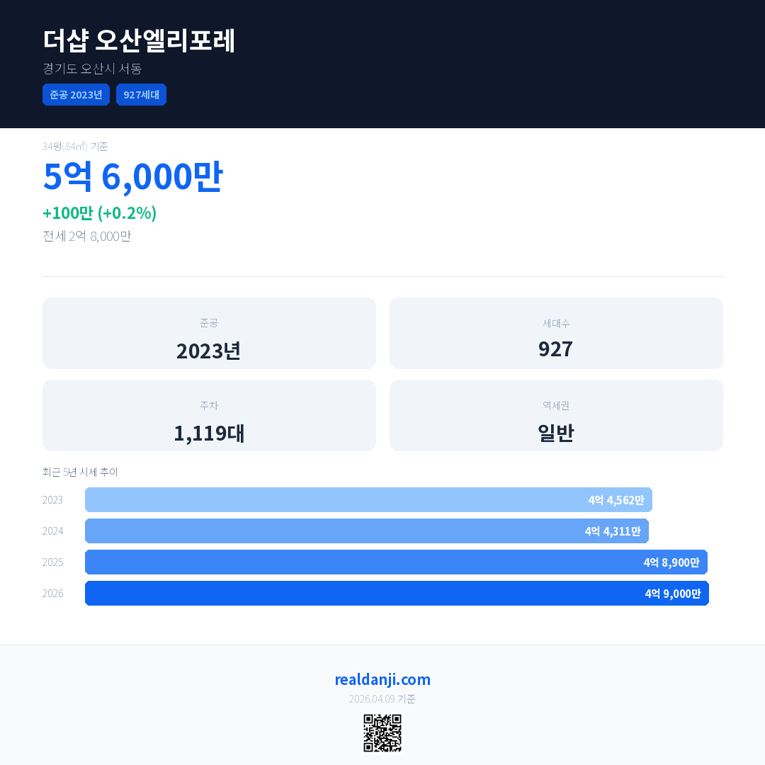 더샵 오산엘리포레 국민평형 기준 2026년 평균 거래가는 4억 9,000만으로, 전년 대비 0.2% 상승 했습니다.