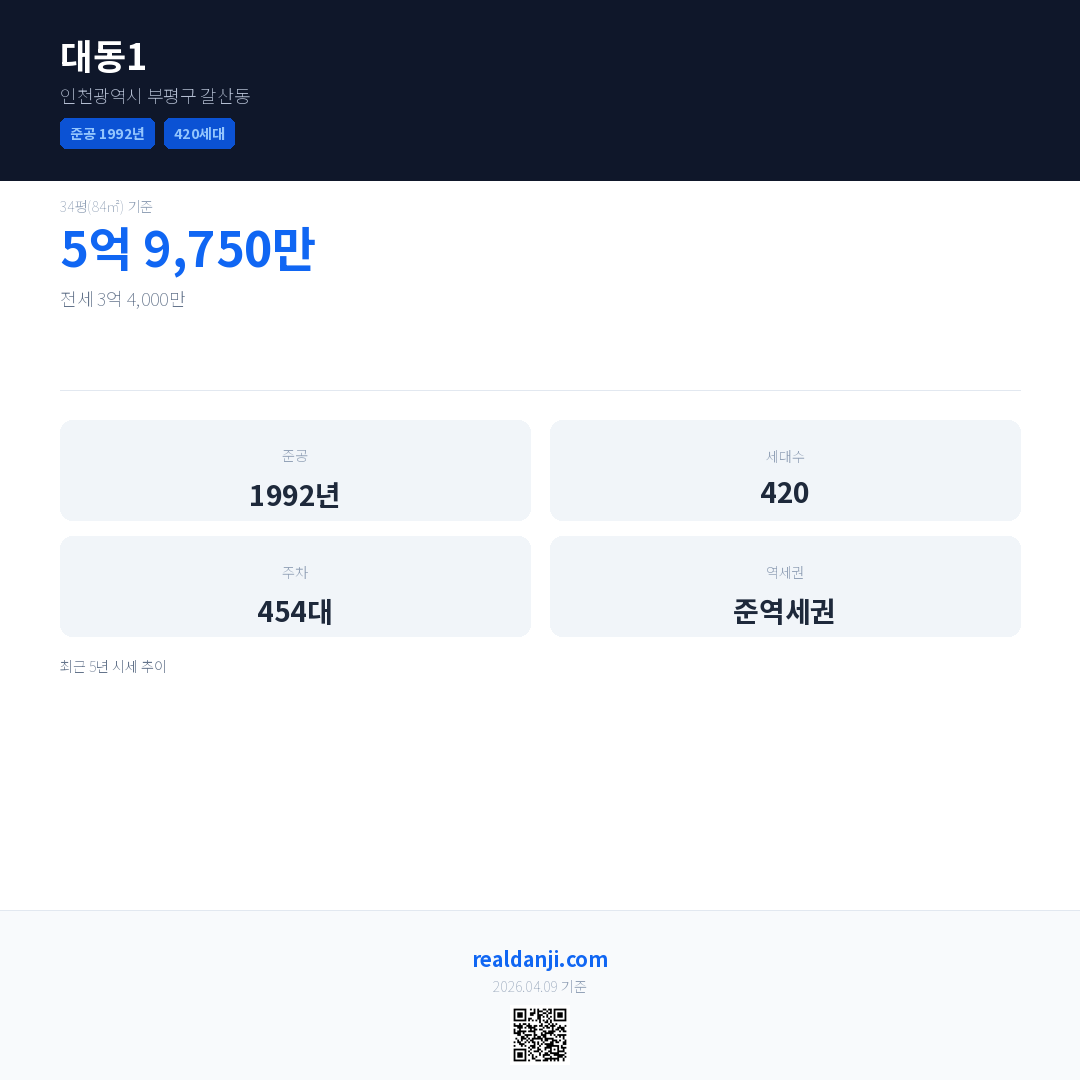 대동1은(는) 1992년에 준공되었으며, 현재 34년차입니다. 총 420세대 규모입니다.