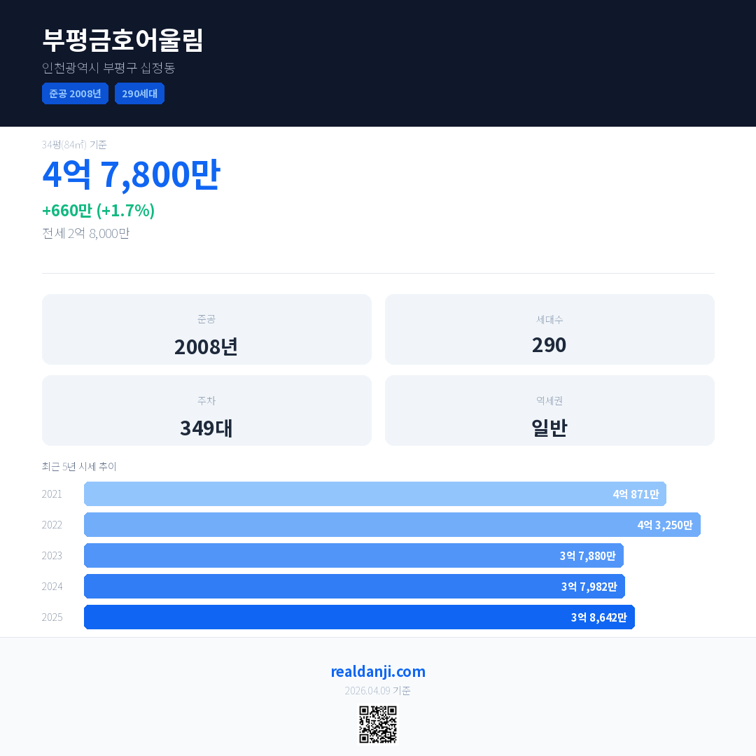 부평금호어울림 국민평형 기준 2025년 평균 거래가는 3억 8,642만으로, 전년 대비 1.7% 상승 했습니다.